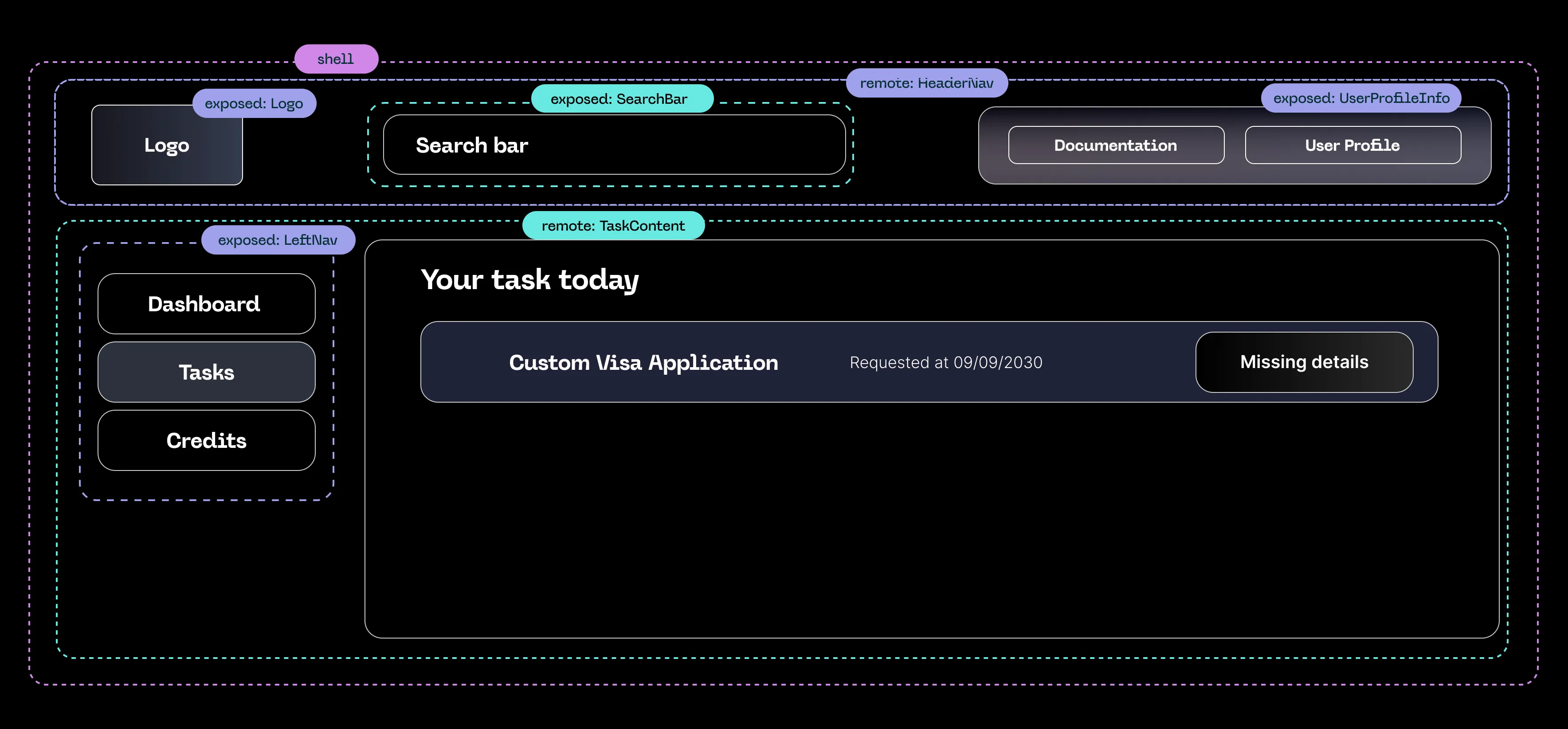 Let's take a look at another example. You have a shell application, within the shell app you have two modules: HeaderNav and TaskContent.